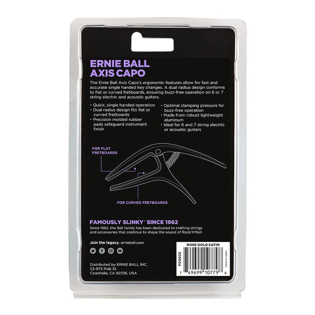 The Ernie Ball Axis Capo's ergonomics features allow for fast and accurate single handed key changes. A dual radius design confirms to flat or curved fretboards ensuring buzz-free operation on 6 or 7 string electric and acoustic guitars.