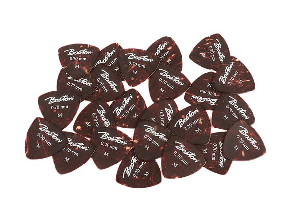 Picks, celluloid, tortoise, standard triangle model, 24-pack, medium, 0.70 mm.